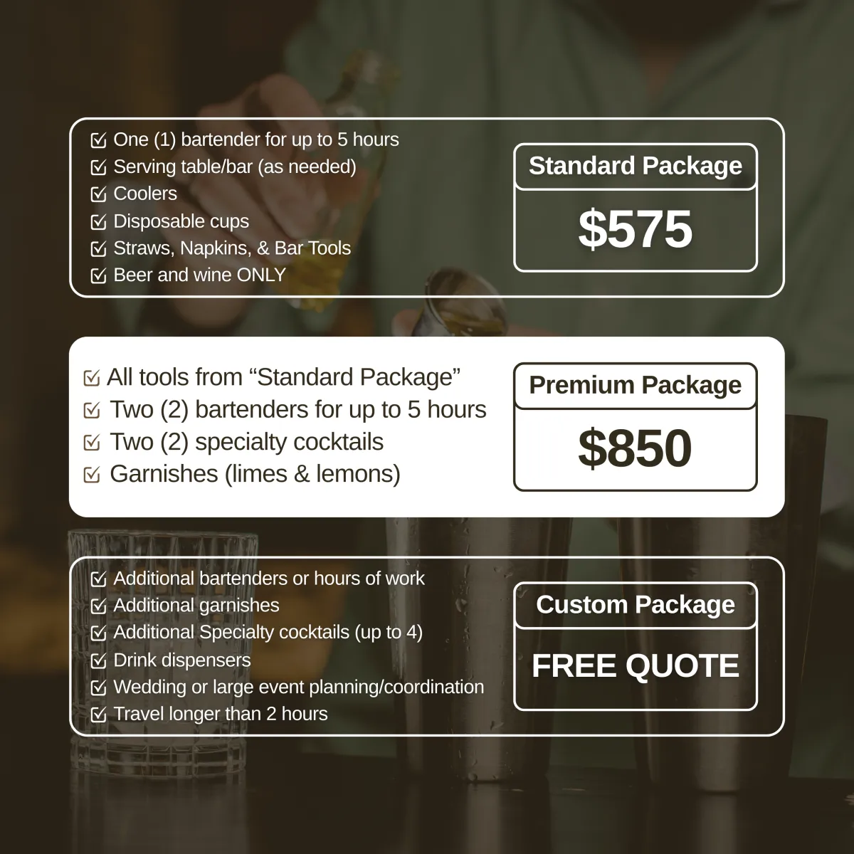 All bartenders are TIPS & ABC certified and insured to provide quality, risk-free service for you and your guests.